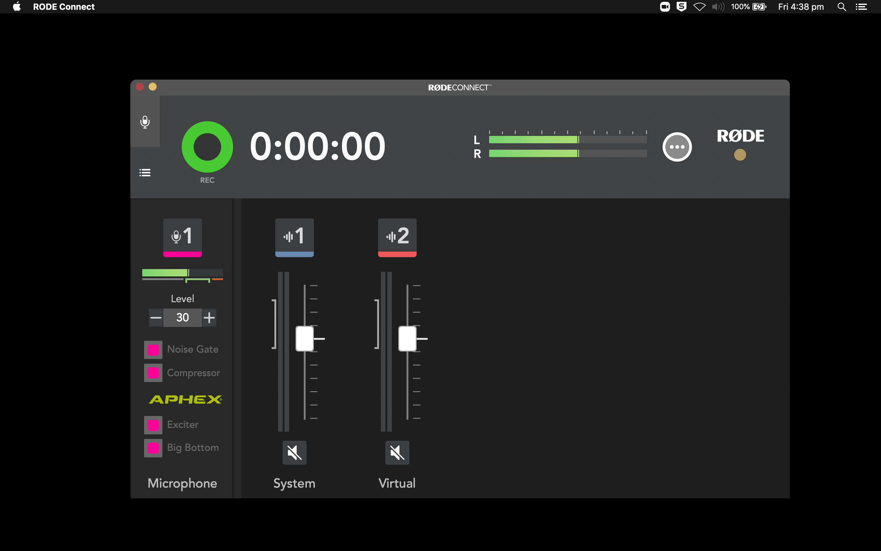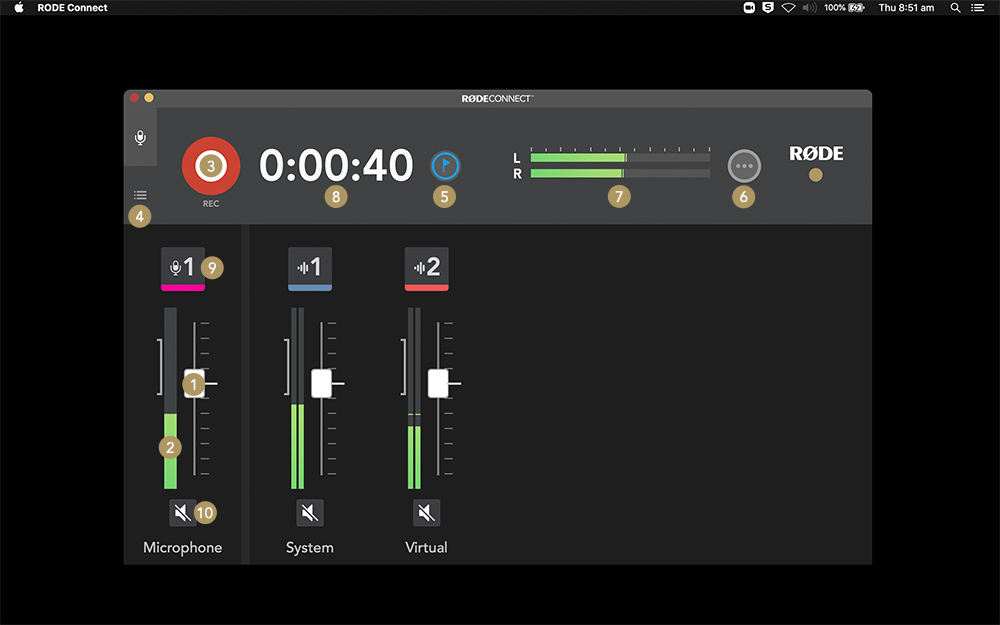 Sau khi thực hiện xong quy trình Hỗ trợ thiết lập, bạn sẽ đến giao diện ghi. Nhấp vào biểu tượng micrô phía trên mỗi kênh sẽ cung cấp cho bạn quyền truy cập vào các điều khiển cấp độ âm thanh của kênh đó.