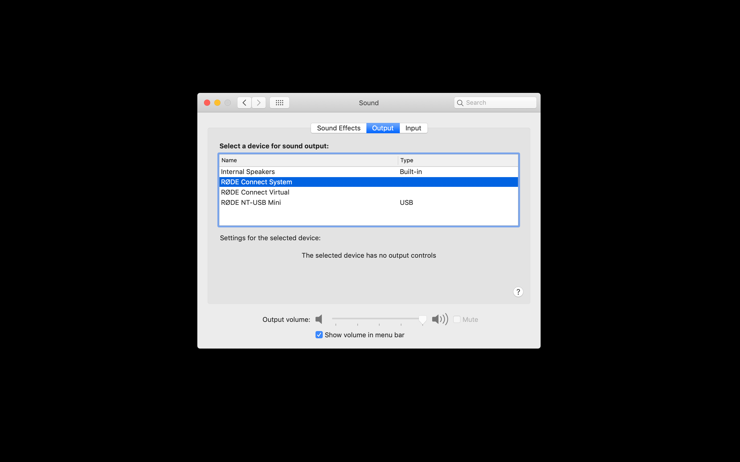 Để định tuyến âm thanh hệ thống của bạn vào RØDE Connect, hãy chuyển đến tùy chọn âm thanh của máy tính và chọn 'RØDE Connect System' làm thiết bị ra âm thanh chính của bạn. Bây giờ, hãy test nhanh để đảm bảo âm thanh được truyền vào bộ trộn bằng cách phát một bài nhạc. Bạn sẽ thấy đèn báo tín hiệu âm thanh của mình nhảy lên và xuống và nghe thấy âm thanh trong tai nghe của mình, cho biết rằng kênh Âm thanh Hệ thống đang nhận âm thanh.