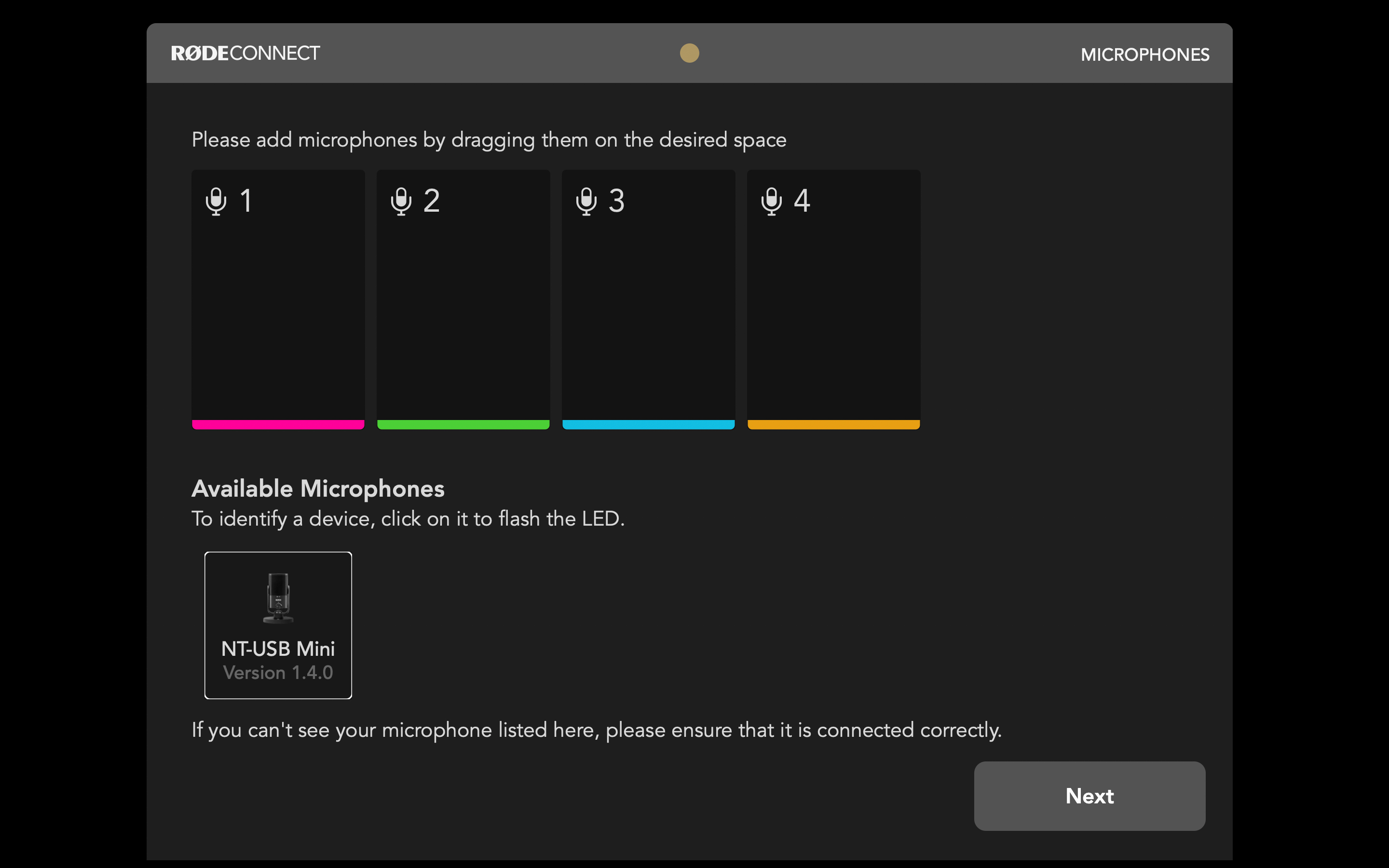 Mở RØDE Connect và nhấp vào 'Get Started' để chạy qua Hỗ trợ thiết lập. Tại đây, bạn có thể phân bổ micrô của mình cho các kênh trong RØDE Connect và thêm các kênh ảo (lưu ý: bạn có thể quay lại Hỗ trợ thiết lập bất kỳ lúc nào).