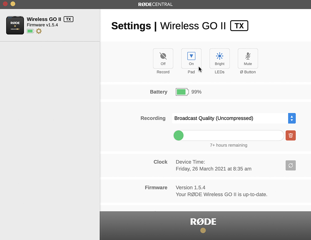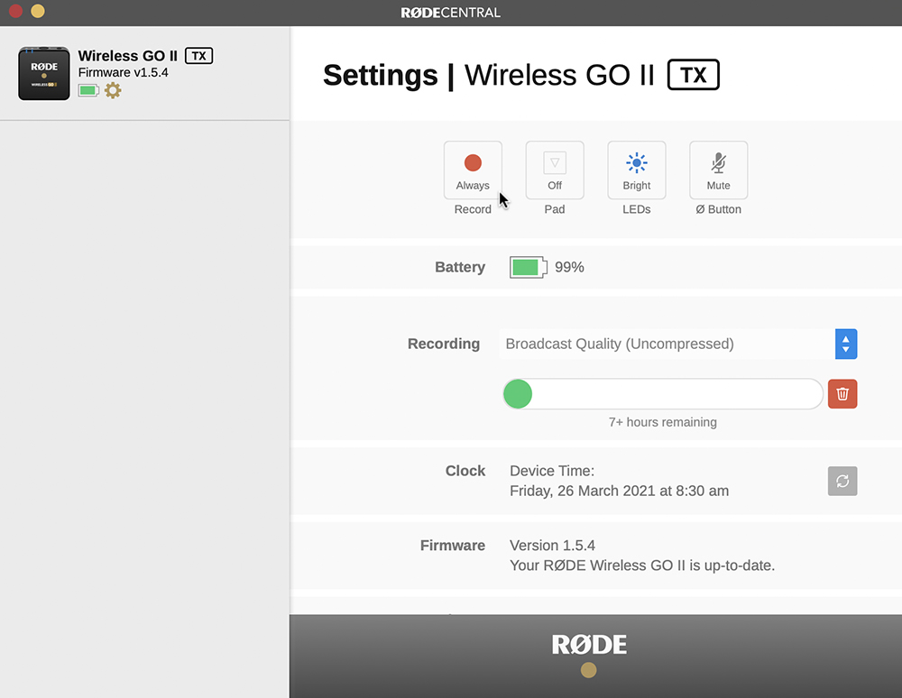 RØDE Central là một ứng dụng đồng hành với Wireless GO II cho phép bạn thiết lập các tùy chọn thiết bị, truy cập, tối ưu hóa và xuất bản ghi, kích hoạt và hủy kích hoạt các chức năng cũng như cập nhật firmware của bạn. Tải xuống miễn phí cho Mac và Windows.