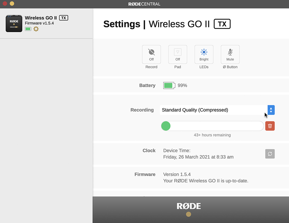 Nhấp vào cài đặt(hình bánh răng) máy phát trong RØDE Central sẽ cho phép bạn xem bạn còn bao nhiêu dung lượng lưu trữ và xóa hàng loạt tất cả các bản ghi trên bộ phát (transmitters).