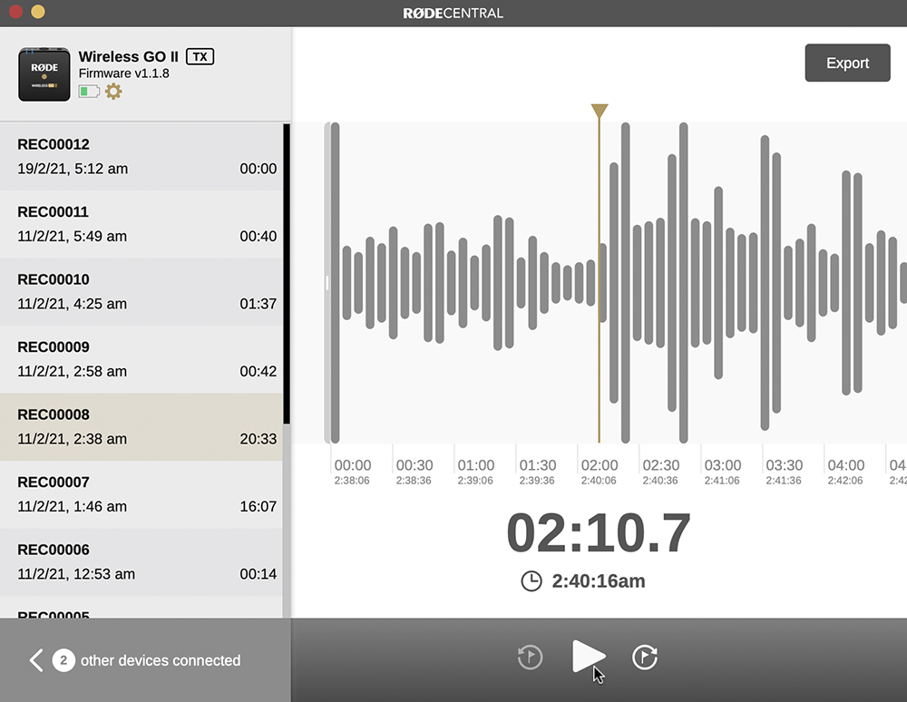 RØDE Central cho phép bạn nghe, tối ưu hóa và xuất tất cả các bản ghi âm của bạn từ bên trong phần mềm. Nhấp vào bản ghi để bắt đầu. Một dạng sóng sẽ được hiển thị với thời gian thực và thời gian ghi đã trôi qua trên bản ghi. Điều này cho phép bạn tua nhanh đến thời gian mong muốn một cách dễ dàng.