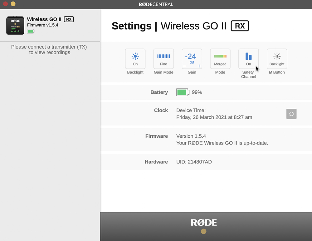 RØDE Central cung cấp cho bạn quyền truy cập vào thông tin cơ bản về Wireless GO II của bạn, bao gồm: