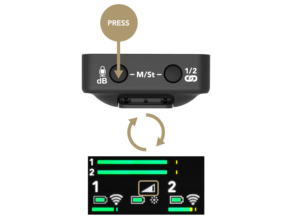 Khi bộ phát (transmitters) mong muốn đã được chọn thông qua lựa chọn kênh, hãy nhấp một lần vào nút điều khiển khuếch đại / tắt tiếng(dB) để tắt tiếng nó. Điều này rất hữu ích khi người điều khiển máy ảnh cần nhanh chóng tắt tiếng một trong các thiết bị phát.