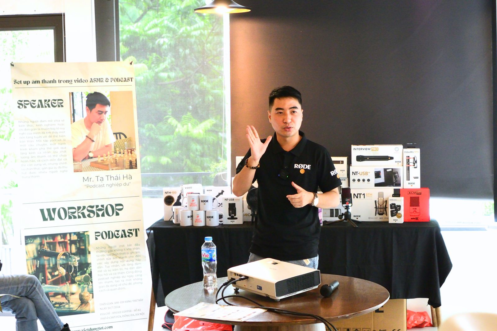 Tạ Thái Hà (Chuyên gia setup âm thanh Podcast) tham gia với tư cách Speaker chia sẻ rất nhiều kinh nghiệm về âm thanh, cách đặt micro, cách mua thiết bị và rất nhiều tips hữu ích cho người tham gia đem lại bầu không khí hết sức sôi động.